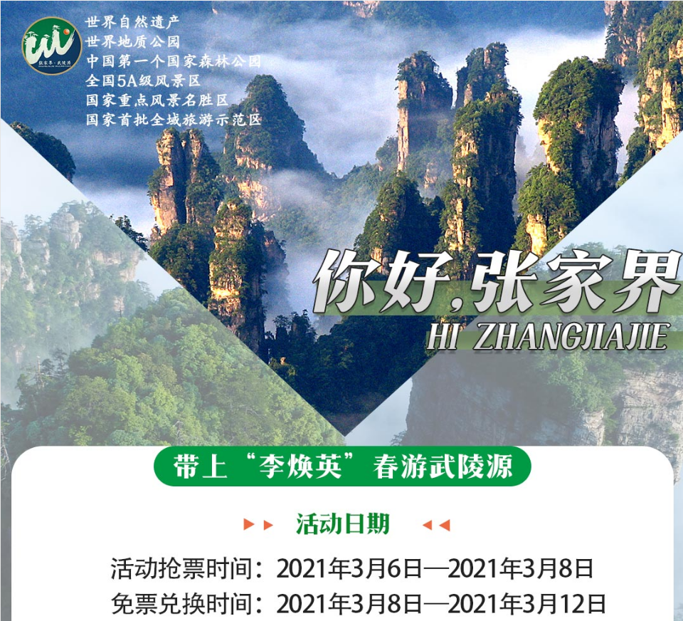 快搶!三八節(jié)張家界武陵源萬張免票搶票活動!2021/03/04