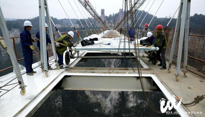 1月27日,湖南張家界大峽谷玻璃橋橋面玻璃首裝成功。