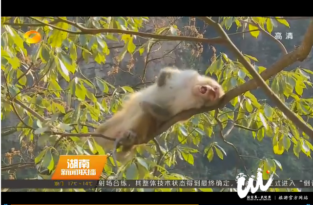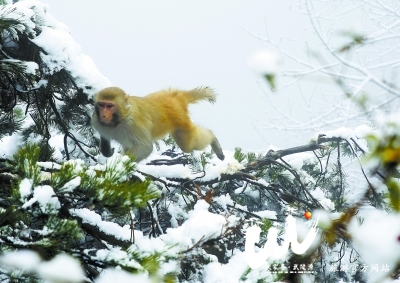 2月22日,元宵節(jié),張家界武陵源喜降春雪。在黃石寨景區(qū),野生獼猴或在雪中追逐戲鬧,或在樹枝攀爬跳躍