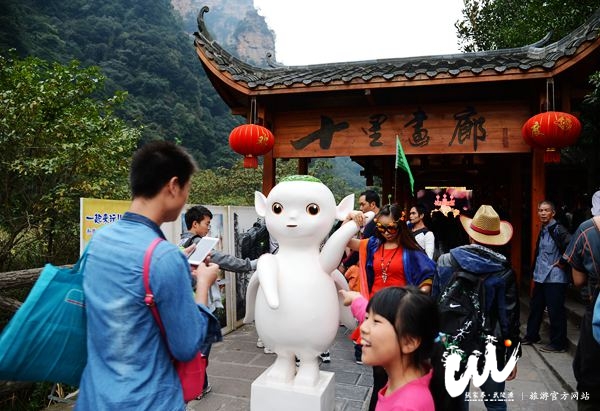 10月4日下午,旅游勝地張家界武陵源十里畫廊景區(qū),不少游客爭相和景區(qū)設(shè)立的《捉妖記》中的小妖王“胡巴”萌娃卡通形象合影留念。