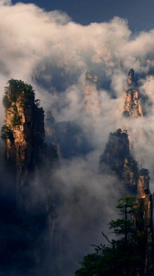 有時(shí),山下細(xì)雨霏霏,山上卻晴空萬(wàn)里 ;有時(shí),山上云遮霧罩,山下卻陽(yáng)光燦爛。美國(guó)好萊塢大片《阿凡達(dá)》中的懸浮山,吸引了全世界觀眾的眼球,其原型就是云海中的武陵源石英砂巖峰林。晴朗的清晨,一輪朝陽(yáng)在五彩云霞簇擁下,從奇山異峰中冉冉升起 ;