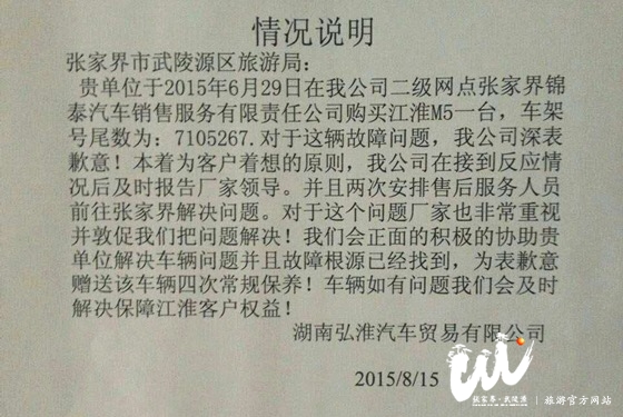 武陵源區(qū)旅游局所購的江淮瑞風(fēng)自動檔多用乘用車,是嚴(yán)格經(jīng)過政府采購程序后購買的,并用作旅游執(zhí)法專用車輛。已經(jīng)辦理了車輛購置稅、車輛保險等相關(guān)手續(xù),車輛尚未行駛出武陵源轄區(qū)。到車輛出現(xiàn)故障之時,行駛里程不到916公里。