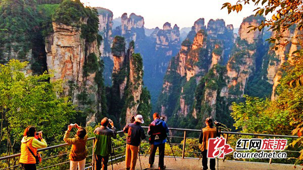(自助游客守候張家界秋色)
