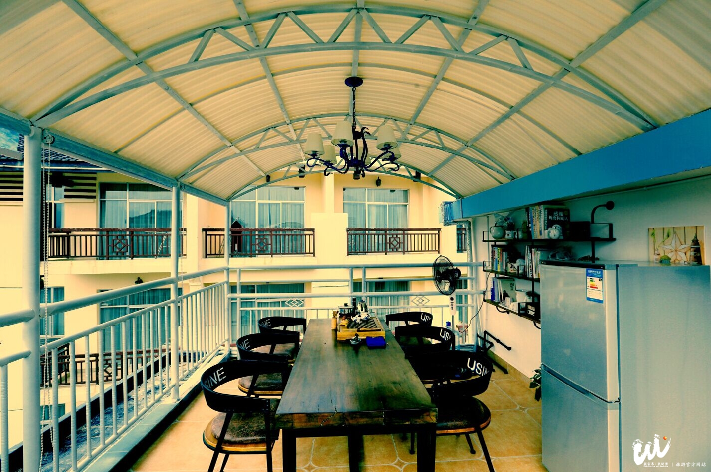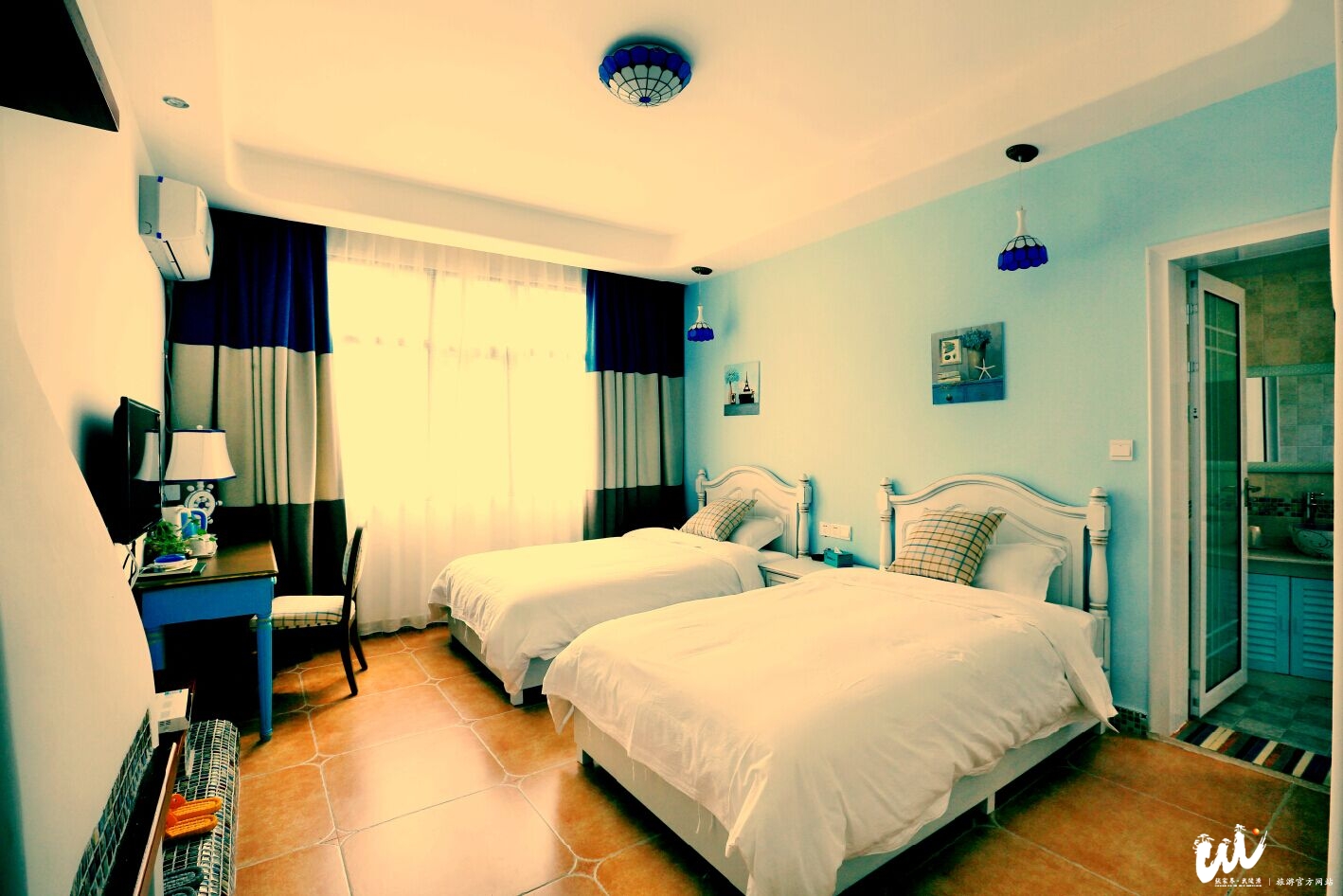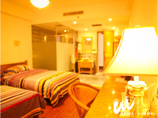 走進“轉(zhuǎn)角1號”前廳,不大的空間卻迷漫著一股小清新,別致的小書吧、小飾物、小盆景,給人一種如家似的溫馨。步入不同樓層的房間,干凈整潔,樸素不失典雅。窗簾、洗漱臺、桌椅、臺燈、吊燈等點綴的藍色調(diào)加上墻面上嵌有船舵、救生圈等船舶裝飾物讓人感覺到仿佛置身于一艘航行在湛藍大海上的遠洋船。