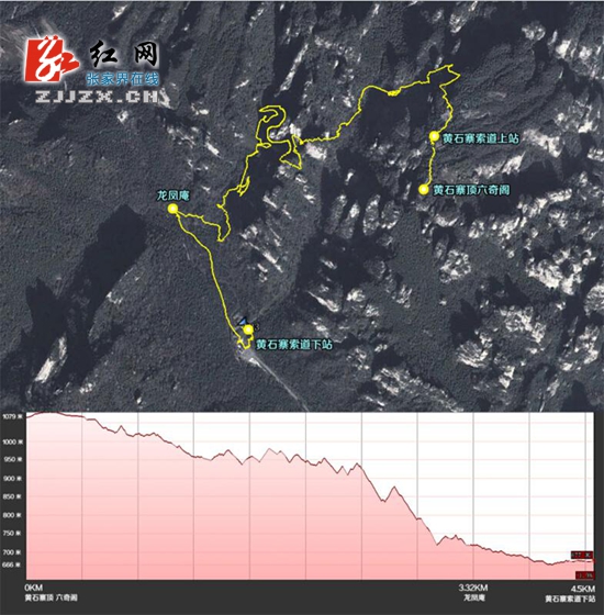 本次比賽的賽道位于張家界國家森林公園黃石寨景區(qū),起于黃石寨山頂最高點(diǎn)--六奇閣,終點(diǎn)是黃石寨索道下站停車坪。整條賽道地形復(fù)雜,彎多坡陡,有多處90°急轉(zhuǎn)彎,坡度達(dá)到45°以上,賽道包含了暗溝、荊棘、碎石、樹藤、凌空跳臺及3000級臺階,是目前國內(nèi)地形最為復(fù)雜、難度系數(shù)最大的一條山地自行車賽道。