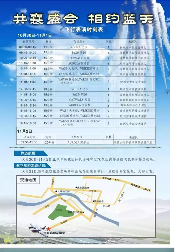 (二)、飛行表演:表演時(shí)間:10月30日上午9:30-11:30 下午:14:30-16:30 10月31日上午9:30-11:30 下午:14:30-16:30 11月01日上午9:30-11:30 下午:14:30-16:30 11月02日上午9:30-11:30 下午:閉幕式·每天上午9:00開(kāi)始動(dòng)力傘,熱氣球暖場(chǎng);