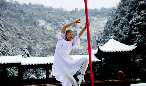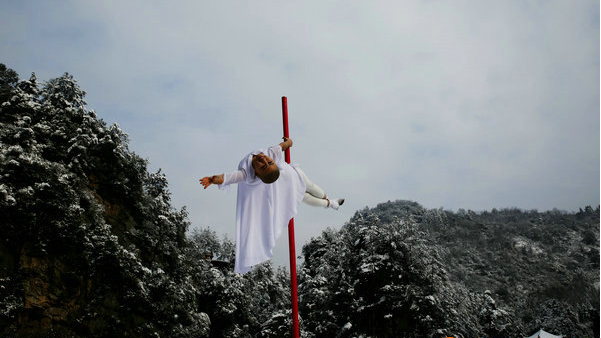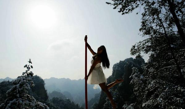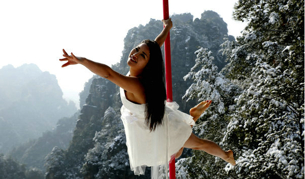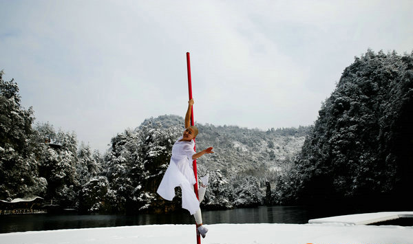 1月23日,韓國(guó)籍鋼管舞高級(jí)教練、第八屆中國(guó)鋼管舞錦標(biāo)賽冠軍金美娜率弟子湖南張家界武陵源寶峰湖景區(qū)上演鋼管舞秀,挑戰(zhàn)寒冬冰雪。吳勇兵攝