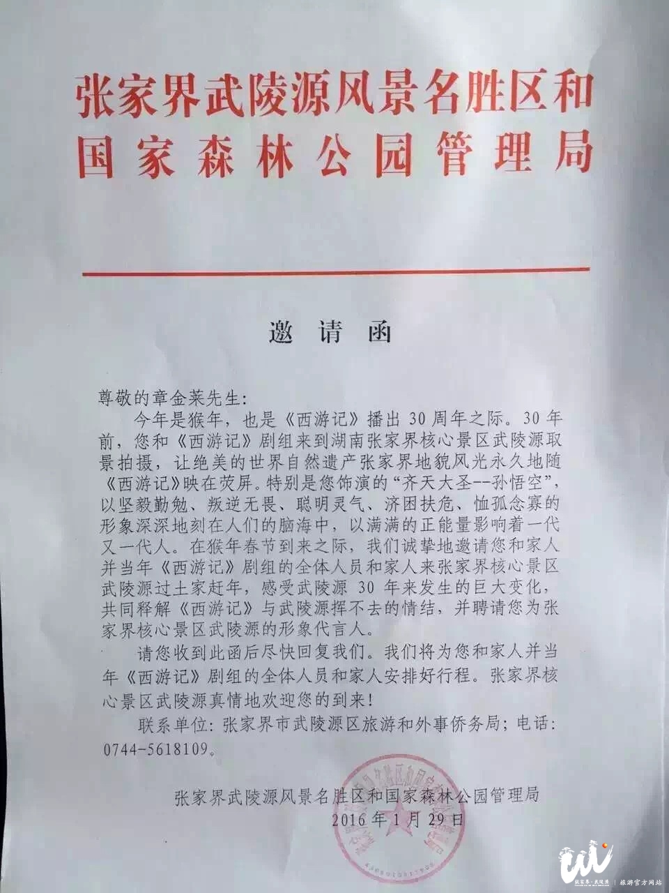 邀請(qǐng)信中說(shuō),今年是猴年,也是86年版《西游記》播出30周年之際。30年前,章金萊和《西游記》劇組來(lái)到張家界核心景區(qū)武陵源水繞四門、十里畫廊、天子山、寶峰湖、黃龍洞等多處精華景點(diǎn)取景拍攝,讓絕美的世界自然遺產(chǎn)張家界地貌風(fēng)光永久地隨《西游記》映在熒屏,走進(jìn)千家萬(wàn)戶,極大地提升了張家界核心景區(qū)武陵源的知名度和美譽(yù)度。特別是章金萊飾演的“齊天大圣--孫悟空”,以堅(jiān)毅勤勉、叛逆無(wú)畏、聰明靈氣、濟(jì)困扶危、恤孤念寡的形象深深地印刻在人們的腦海中,以滿滿的正能量影響著一代又一代人。