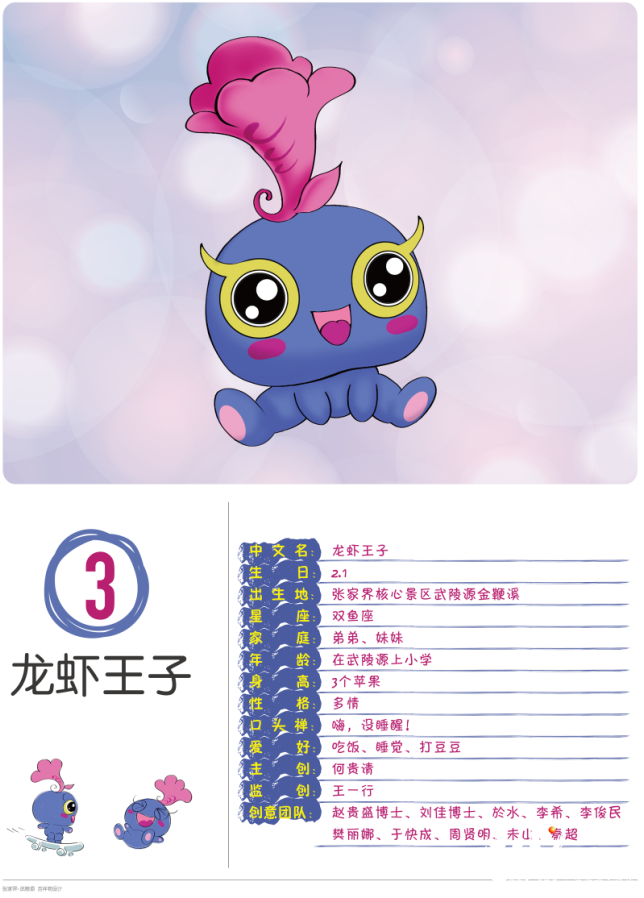 創(chuàng)意與設(shè)計說明:龍蝦花是張家界核心景區(qū)武陵源特有的植物之一,也是世的珍貴植物,廣布于金鞭溪、畬刀溝、十里畫廊、西海、黃石寨、等陰濕地。龍蝦花是一種最古老的花,億萬年來保持其形狀不變,形如大海中的龍蝦而得名,以花瓣組合似蝦而取名。以張家界核心景區(qū)武陵源內(nèi)的珍貴物種“龍蝦花”為吉祥物創(chuàng)作元素,突出龍蝦花“一花一世界”的文化特點,設(shè)計出的龍蝦王子吉祥物將張家界核心景區(qū)武陵源的“自然與生態(tài)”、 “生命與奇跡”、“吉祥與祝?!钡壤砟钪鹨粋鬟f。