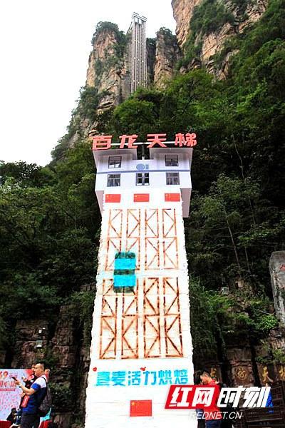 張家界武陵源核心景區(qū)百龍?zhí)焯菹?,高達(dá)3.35米、重達(dá)480公斤的巨型蛋糕亮相。