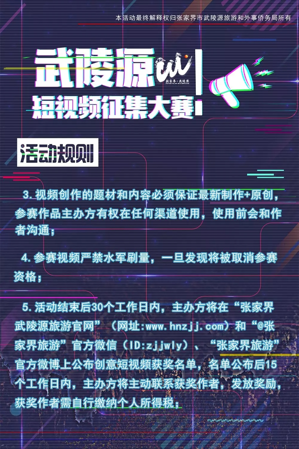 2. 參賽必須標(biāo)注“張家界武陵源短視頻征集大賽”,不標(biāo)注視為無(wú)效;請(qǐng)各參賽用戶(hù)在本次活動(dòng)正式結(jié)束后的1天內(nèi),按“姓名+電話(huà)+平臺(tái)用戶(hù)ID+參賽的短視頻鏈接”格式命名,并將能看到參賽視頻瀏覽量、點(diǎn)贊數(shù)、轉(zhuǎn)發(fā)數(shù)、評(píng)論數(shù)的截圖作為附件,一并發(fā)送至主辦方郵箱zjjwlylyj@163.com,逾期視為參賽無(wú)效;