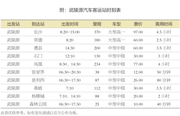 附:武陵源汽車客運站時刻表(具體班次、線路和票價可能會變動或調整,具體請咨詢武陵源區(qū)汽車站熱線:0744-5615611)