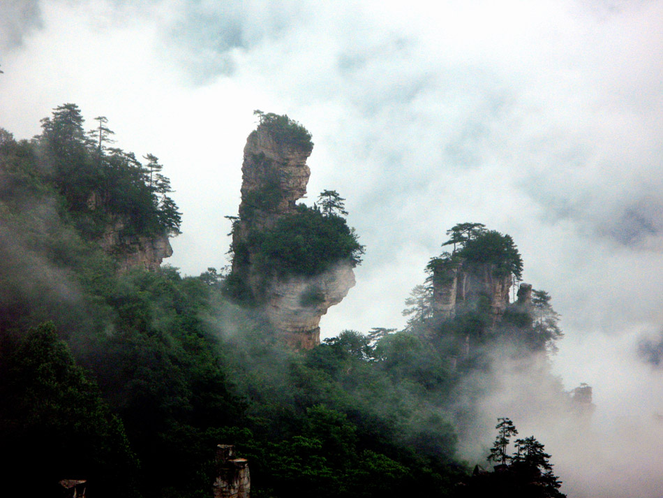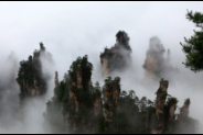 位于天子閣80米西側(cè)深谷中。一排6根石柱,每柱高約百米,方正如削,頂天并立,參差相連,且上細下粗,形如筆桿。傳為向王天子所用之筆。四周諸峰呈環(huán)形之勢,相互抱擁,近前左右空曠,翠樹纏擁,其后千百峰巒在霧靄中漸漸退隱。唯此御筆峰叢所處位置偏高,線條、棱角清晰可見,更顯突兀高峻。尤其是柱石纖細,仿佛人造,縫痕如撕,依次相依,又有蒼松幾棵傲立其間,俊美非凡。