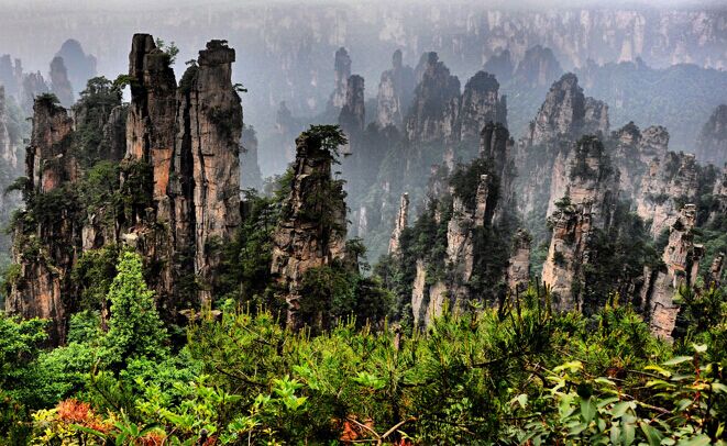 位于賀龍公園西畫1500米處,為觀景臺。臺分3級,周邊有鐵欄桿圍護。谷間群峰競立,數(shù)十余座峰柱似四十八將軍校場閱兵點將場面。凌空而觀,神堂灣豁然曠闊。下視無底深淵,令人目眩。灣底悠悠,鳥鳴如歌,蟬奏如琴,交響成曲,聲揚空谷。雨后雪余,霧起峰浮。晴初日出,巖石生輝。
