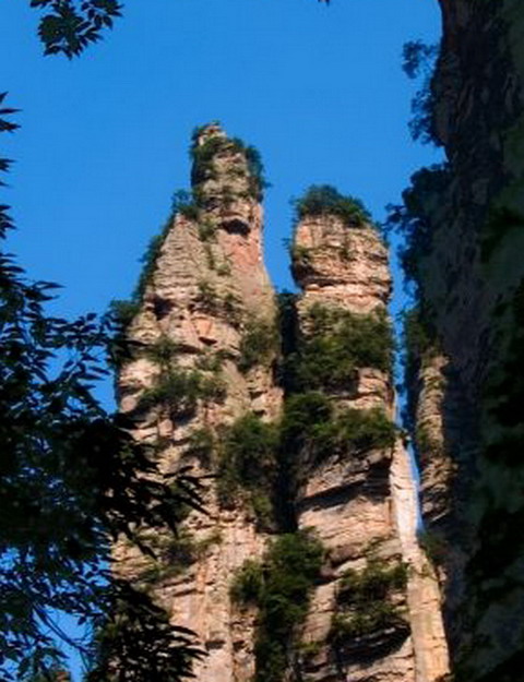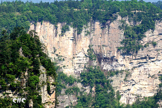 臨近張家界森林公園 黃石寨頂,回頭東眺,千米外的腰子寨西沿絕壁上有風雨剝蝕的紋理痕跡和點綴其中的花草灌木,構成一幅充滿土家族鄉(xiāng)土氣息的天然壁畫。