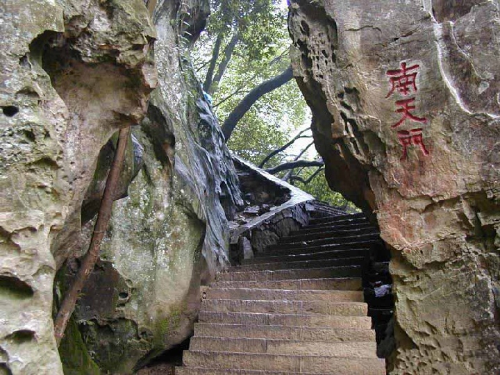 登黃石寨山路東南側有十多平方米 傾斜巖峰與千韌石壁拱成一門,面南洞開。石徑穿門而過,門孔狹窄幽深;兩邊野樹簇擁,門外云蒸霞蔚,頗有神話中南天門之尊。更奇者,于南天門右側挺出怪石一尊,與人體形相仿,高約20米,形態(tài)威武、凜凜肅立,如同把守天門將軍。