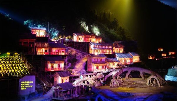 該劇由中國實(shí)景演出創(chuàng)始人梅帥元執(zhí)導(dǎo),享譽(yù)世界的華人音樂家譚盾擔(dān)任音樂總監(jiān),舞臺(tái)搭建于天門山下峽谷中,以落差一千多米的張家界天門山為背景,以山澗峽谷為表演舞臺(tái),1.2億巨資打造,500演員同臺(tái)傾情演繹。