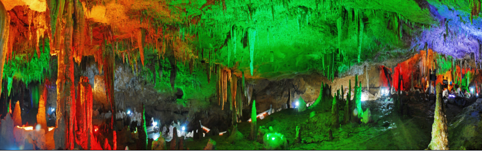 黃龍洞分旱洞和水洞。共四層,長(zhǎng)13公里,最高處百余米。屬石灰?guī)r地下河侵蝕型洞穴。兩層水洞與兩層旱洞上下縱橫,形成洞下洞,樓上樓螺旋結(jié)構(gòu),最大洞廳的面積12000平方米,可容納上萬(wàn)人。洞內(nèi)有一個(gè)水庫(kù)、兩條陰河、三條地下瀑布、四個(gè)水潭、十三個(gè)大廳、九十六條游廊。洞內(nèi)流痕、邊石、倒石芽、倒鍋狀窩穴階段發(fā)育良好,鈣質(zhì)石積物呈五顏六色,絢麗多資。穹頂石壁滴水沉淀的石乳、石柱、石筍、石幔、石琴、石花,如水晶玉石,琳瑯滿目,異彩紛呈,美不勝收,有“地下迷宮”之美稱。