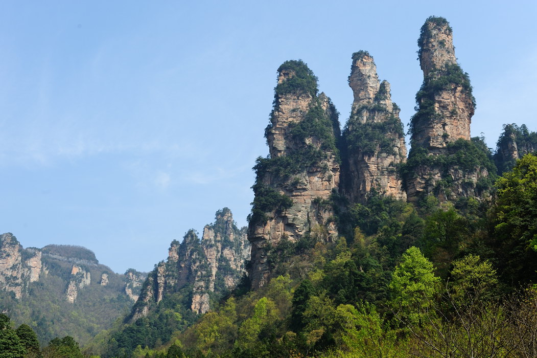 三姐妹峰位于十里畫廊峽谷最深處,是十里畫廊的精華景點之一。三根石峰并排矗立,活脫脫就是三個姐妹并排而立,左邊的是大姐,身上背著一個孩子,中間的是二姐,懷里抱著一個孩子,右邊的是小妹,剛剛結(jié)婚,肚子里懷著一個孩子。