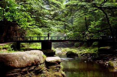 位于紫草潭下游。若把金鞭溪比作絕代麗人,兩潭則是其一雙動人的眼睛。跳魚潭也是由溪水沖刷成的石槽,水流傾瀉入潭,形成落差,游魚在產(chǎn)子期溯水而上,至此活蹦亂跳,故名跳魚潭。