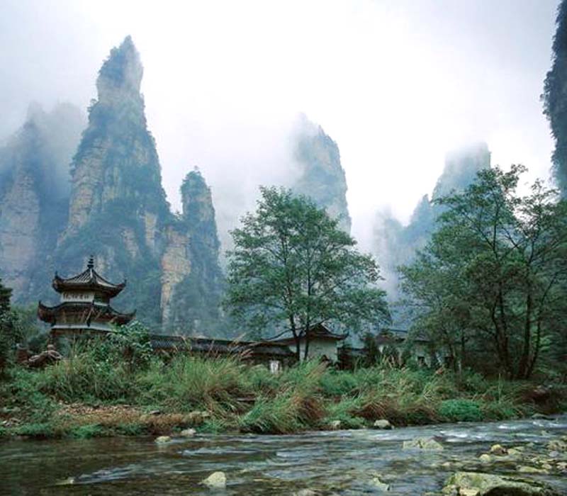 “水隨山轉(zhuǎn),山因水活”、“溪水因山成曲折,山溪隨地作低平”。金鞭溪的水流到這里,此處地勢平坦,積沙成州,傳說是“向王天子”的出生地,故古代又名“天子州”。站在天子州向前眺望,遠(yuǎn)處石峰上那“簽筒筆架萬歲牌”的七個(gè)大字,還依稀可辨,傳說它是當(dāng)年向王天子坐朝受拜的地方。在這里,還可以看到古人模樣的“四十八大將軍”中的好幾個(gè)。從這里向東北可去索溪峪;向西南可去張家界;向西可上天子山,是一處行旅方便之地。如今,這里以修建了旅游新村,專供游人住宿休息,為了撫平一天的勞頓,更好的養(yǎng)精蓄銳,探索未知的風(fēng)光名勝。